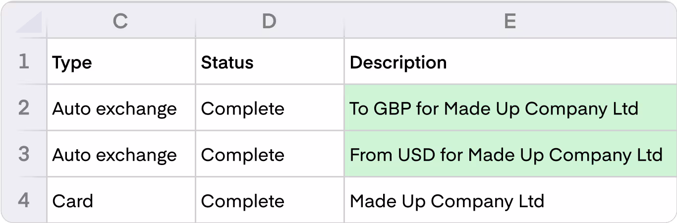 The “Description” column for credits and debits will be enhanced to show the currency exchanged. For example, if funds are being taken from your GBP balance and exchanged into USD, the description for the debit from the GBP balance would show “To USD” and the description for the credit column will show “From GBP”. Similarly, for auto exchanges (currency alignment), we now show the currency exchanged. For example, “To GBP for Auto exchange” and “From USD for Auto exchange”.
