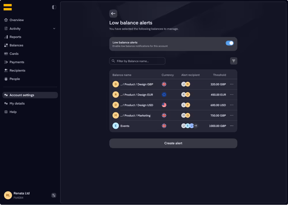 They can create, assign and manage alerts for any Balance, whether that’s the main Account Balance, or the sub-balances underneath it. Both Shared and Individual Balances can have alerts set.